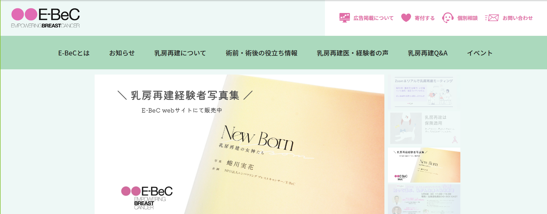 乳房再建経験者の写真集『いのちの乳房』を出版したSTPプロジェクトを母体にE-BeCを設立。2024年10月に、写真家の蜷川実花氏の撮りおろしによる乳房再建経験者の写真集 第2弾を出版。 「『乳房再建手術』への正しい理解と乳がん患者さんのQOL向上を目指し、首都圏および地方で乳房再建セミナーを開催するとともに、毎月1回、Zoomとリアルのピアサポートミーティングを開催しています。また「乳房再建Hand Book」を作成し乳腺外科、形成外科に配布して活用いただいています。さらに「乳房再建に関するアンケート調査」を継続して行い、広く社会に発信しています。 |