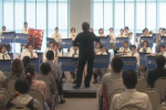 横浜市旭区の中学生を中心に、27人の熱意ある若人が当センターに集いました。講師は、現場の第一線で働く外科医や看護師、技師たちです。マスクや帽子、手術衣、手袋をはめて、本物の手術で使う針と糸を使った縫合の仕方や、内視鏡手術のトレーニングマシン、超音波メスに最新の心肺蘇生方法、放射線治療の実際などを、数名の班に分かれて医療現場の模擬体験をしました。